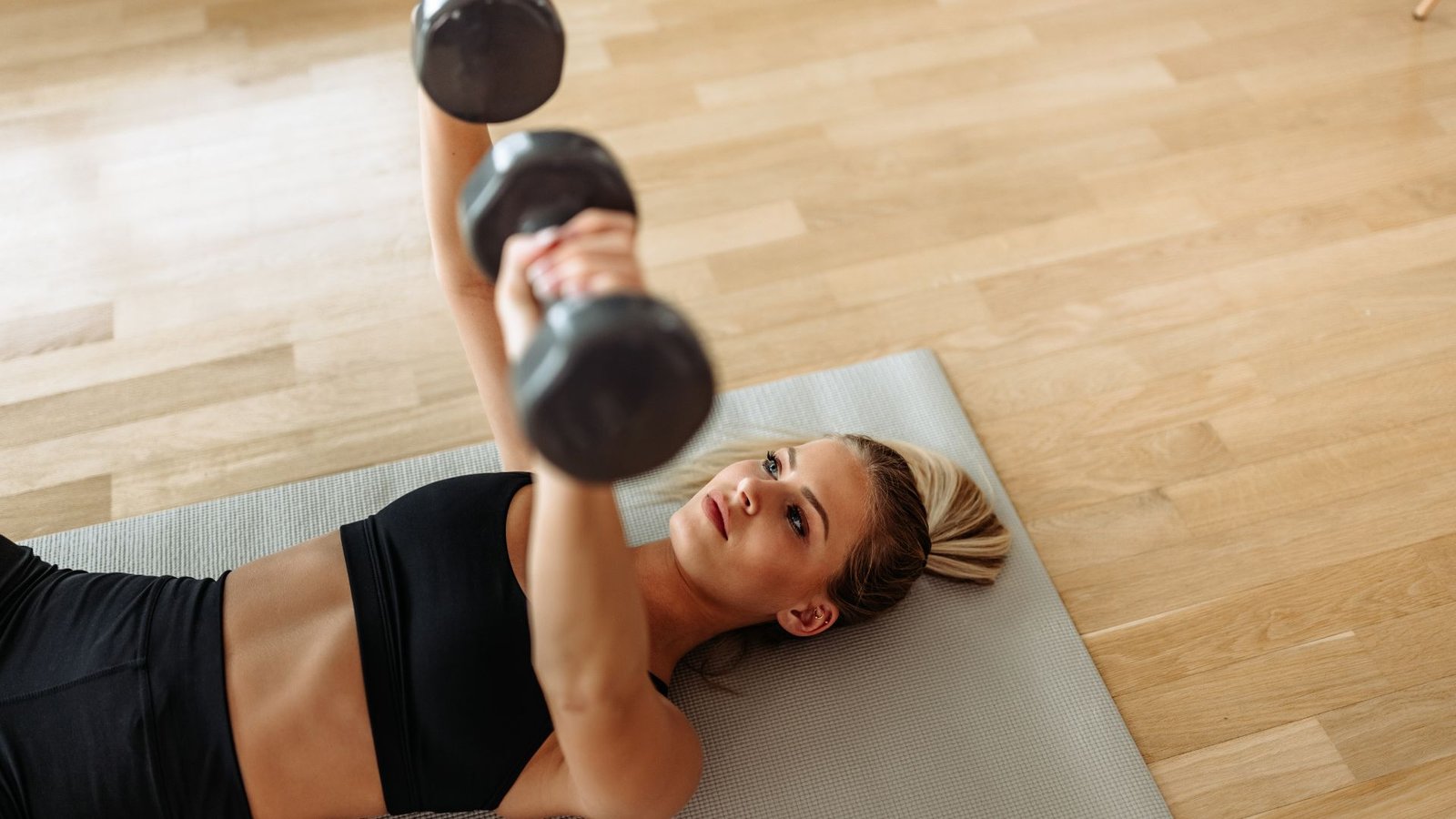 • Lie flat on the floor with a dumbbell in each hand.